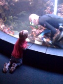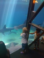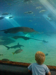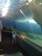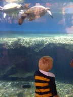 The Sea Turtle (honu) lagoon is nearby. We stand up top to watch their heads pop up as they take a breath, then down the stairs, we watch them play under the water through the glass. Sometimes, they have baby honu in the tank and they aren’t much bigger than a potato chip. Soo cute, I could eat them! The hammerhead shark tank is next and just like the honu, you can watch them on top of the water with their fins cutting the surface, or underneath through the glass.